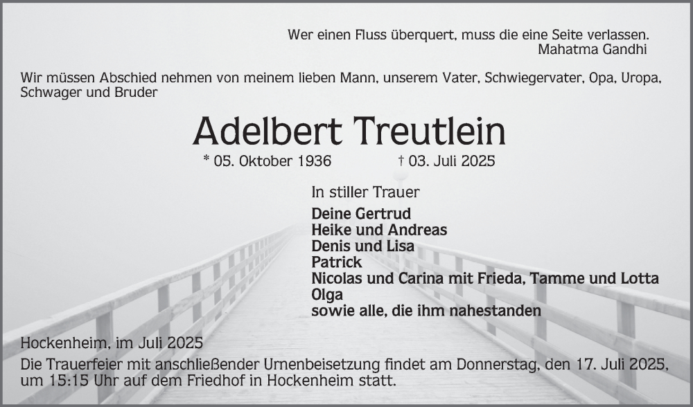 Hier finden Sie alle Traueranzeigen aus der Zeitung, die bisher für Adelbert Treutlein erschienen sind. Weitere Traueranzeigen, die in der Zeitung erscheinen, werden hier ebenfalls aufgelistet