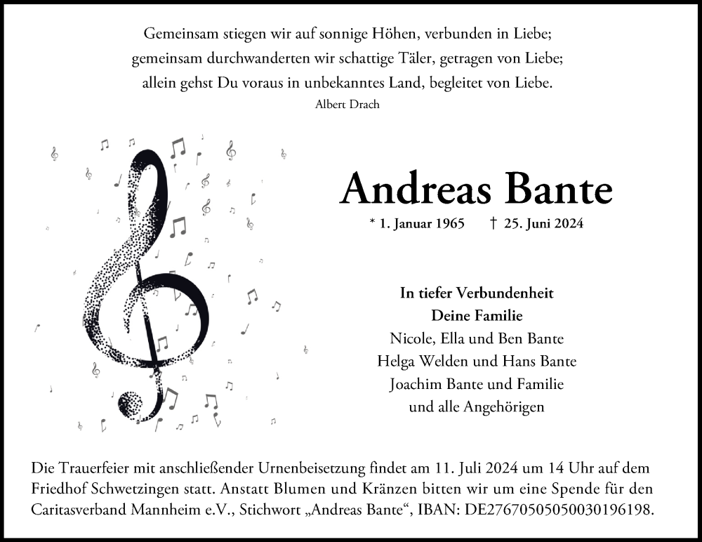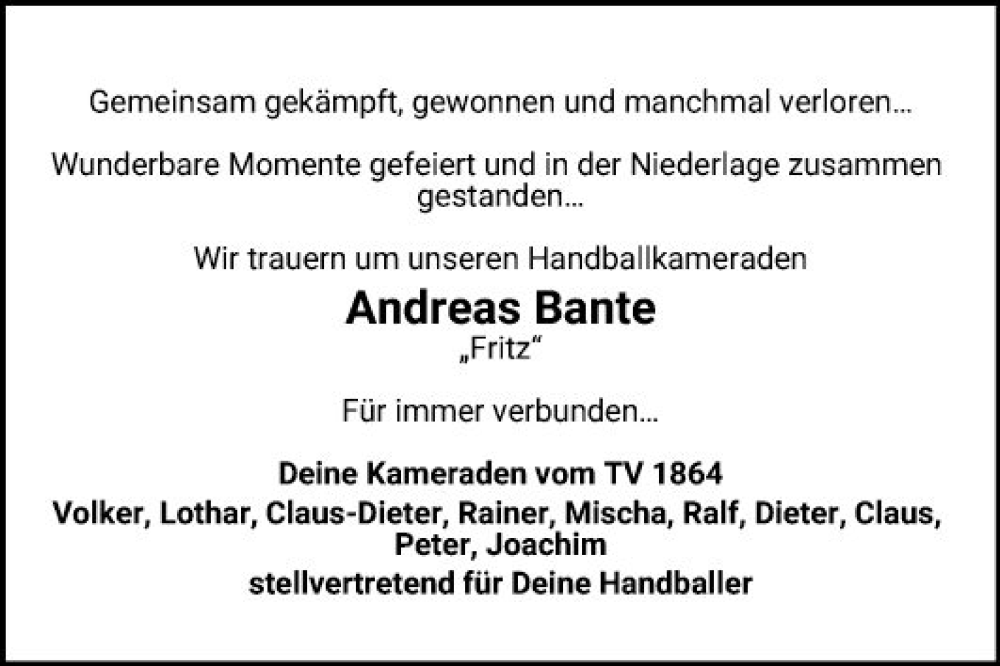 Hier finden Sie alle Traueranzeigen aus der Zeitung, die bisher für Andreas Bante erschienen sind. Weitere Traueranzeigen, die in der Zeitung erscheinen, werden hier ebenfalls aufgelistet