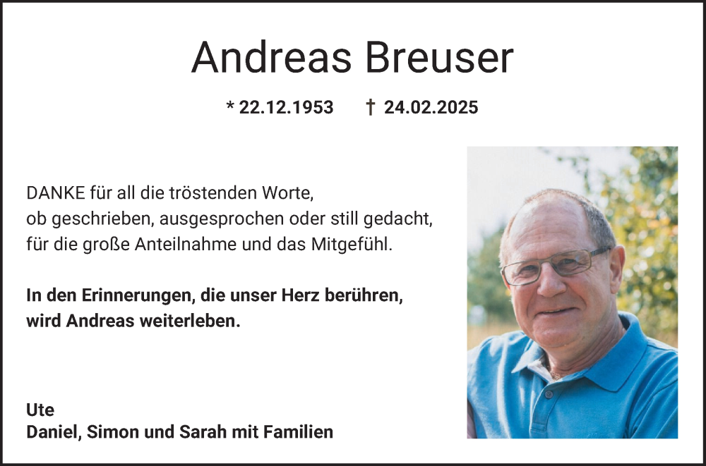 Hier finden Sie alle Traueranzeigen aus der Zeitung, die bisher für Andreas Breuser erschienen sind. Weitere Traueranzeigen, die in der Zeitung erscheinen, werden hier ebenfalls aufgelistet