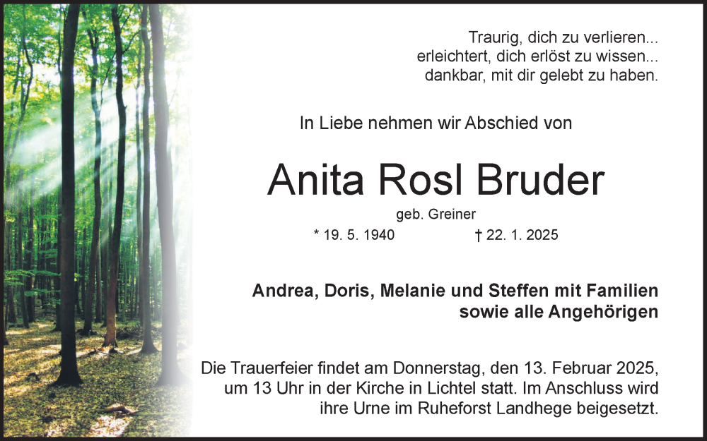 Hier finden Sie alle Traueranzeigen aus der Zeitung, die bisher für Anita Rosl Bruder erschienen sind. Weitere Traueranzeigen, die in der Zeitung erscheinen, werden hier ebenfalls aufgelistet