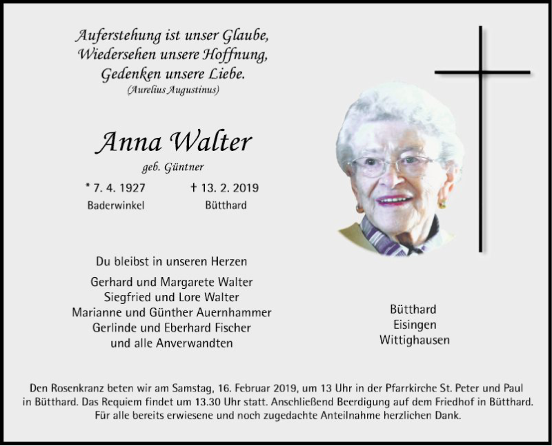 Hier finden Sie alle Traueranzeigen aus der Zeitung, die bisher für Anna Walter erschienen sind. Weitere Traueranzeigen, die in der Zeitung erscheinen, werden hier ebenfalls aufgelistet