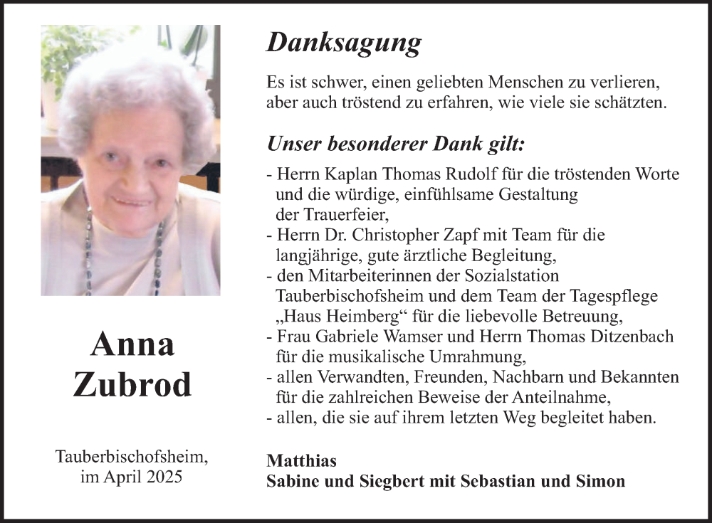Hier finden Sie alle Traueranzeigen aus der Zeitung, die bisher für Anna Zubrod erschienen sind. Weitere Traueranzeigen, die in der Zeitung erscheinen, werden hier ebenfalls aufgelistet