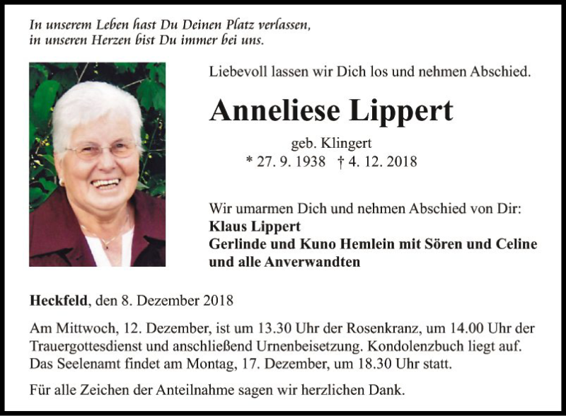Hier finden Sie alle Traueranzeigen aus der Zeitung, die bisher für Anneliese Lippert erschienen sind. Weitere Traueranzeigen, die in der Zeitung erscheinen, werden hier ebenfalls aufgelistet
