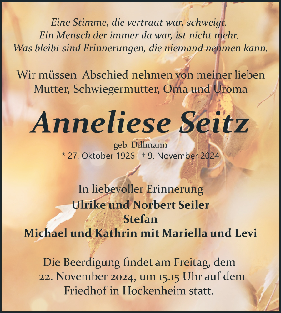 Hier finden Sie alle Traueranzeigen aus der Zeitung, die bisher für Anneliese Seitz erschienen sind. Weitere Traueranzeigen, die in der Zeitung erscheinen, werden hier ebenfalls aufgelistet