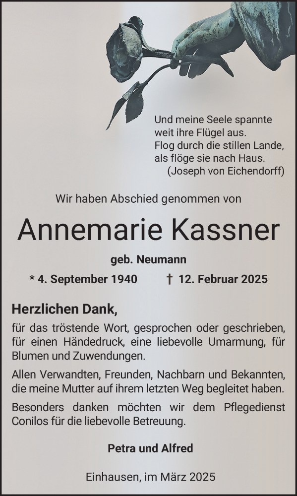 Hier finden Sie alle Traueranzeigen aus der Zeitung, die bisher für Annemarie Kassner erschienen sind. Weitere Traueranzeigen, die in der Zeitung erscheinen, werden hier ebenfalls aufgelistet