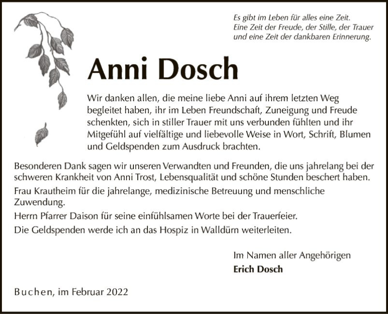 Hier finden Sie alle Traueranzeigen aus der Zeitung, die bisher für Anni Dosch erschienen sind. Weitere Traueranzeigen, die in der Zeitung erscheinen, werden hier ebenfalls aufgelistet