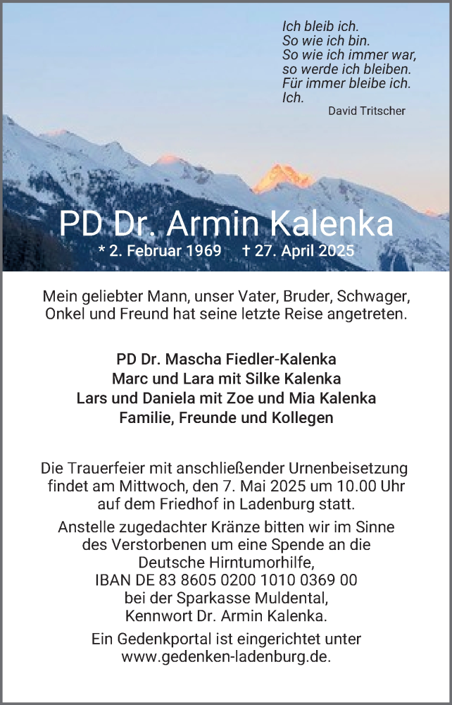 Hier finden Sie alle Traueranzeigen aus der Zeitung, die bisher für Armin Kalenka erschienen sind. Weitere Traueranzeigen, die in der Zeitung erscheinen, werden hier ebenfalls aufgelistet