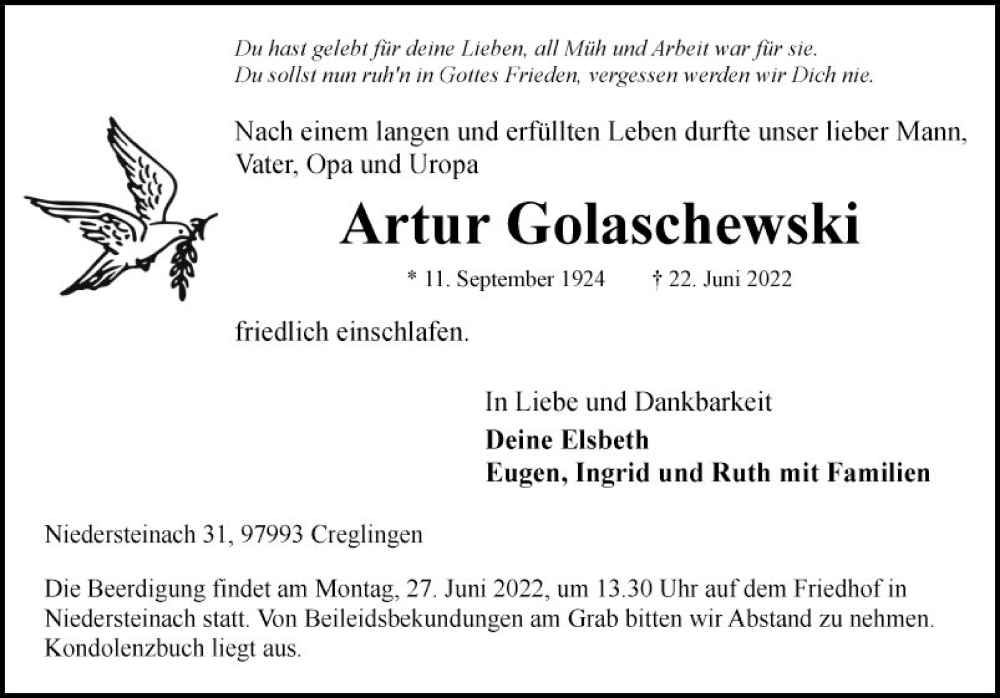 Hier finden Sie alle Traueranzeigen aus der Zeitung, die bisher für Artur Golaschewski erschienen sind. Weitere Traueranzeigen, die in der Zeitung erscheinen, werden hier ebenfalls aufgelistet
