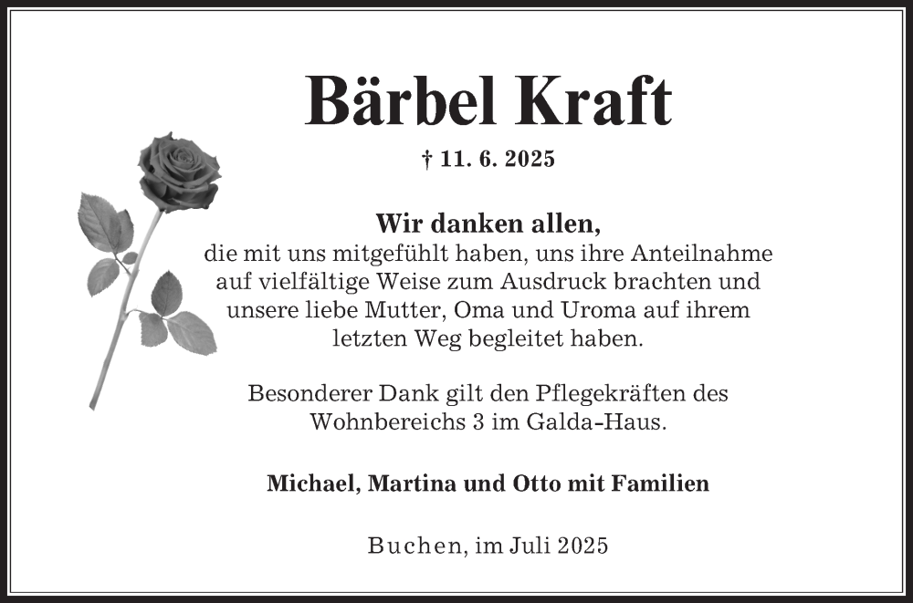 Hier finden Sie alle Traueranzeigen aus der Zeitung, die bisher für Bärbel Kraft erschienen sind. Weitere Traueranzeigen, die in der Zeitung erscheinen, werden hier ebenfalls aufgelistet