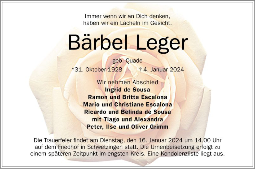 Hier finden Sie alle Traueranzeigen aus der Zeitung, die bisher für Bärbel Leger erschienen sind. Weitere Traueranzeigen, die in der Zeitung erscheinen, werden hier ebenfalls aufgelistet