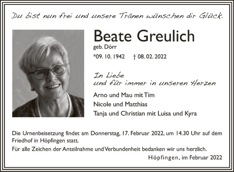 Hier finden Sie alle Traueranzeigen aus der Zeitung, die bisher für Beate Greulich erschienen sind. Weitere Traueranzeigen, die in der Zeitung erscheinen, werden hier ebenfalls aufgelistet