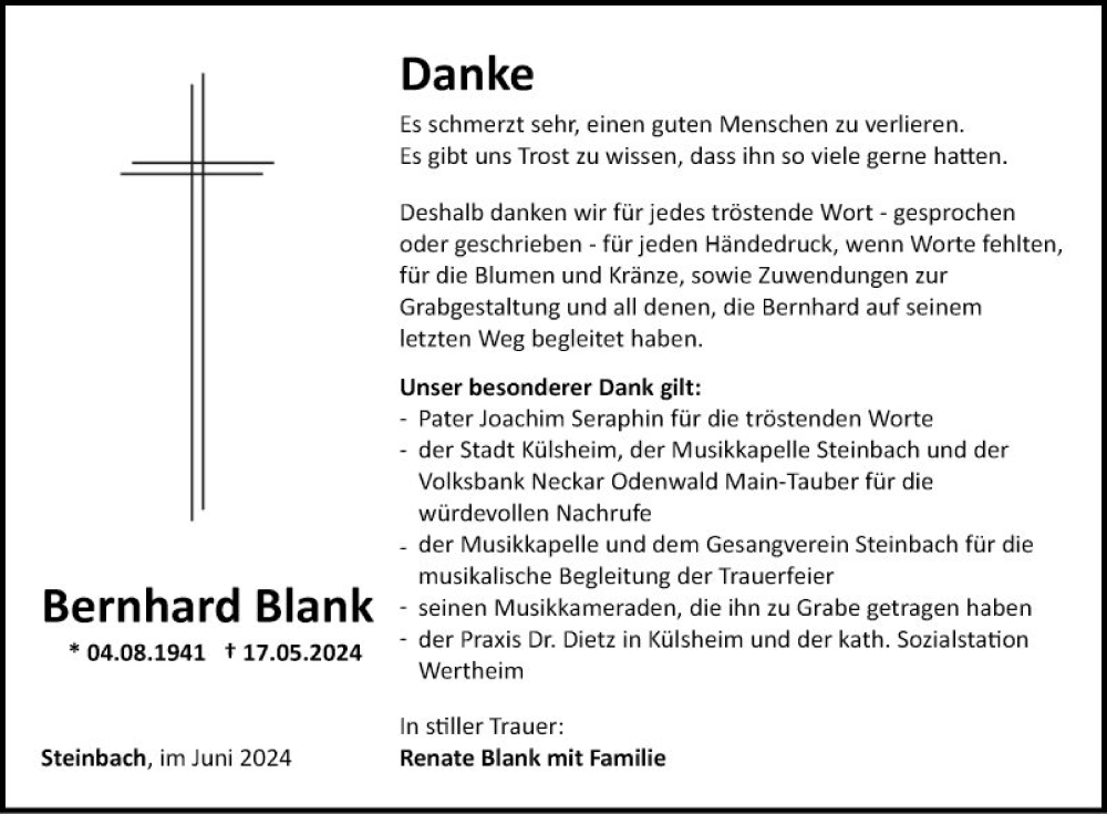 Hier finden Sie alle Traueranzeigen aus der Zeitung, die bisher für Bernhard Blank erschienen sind. Weitere Traueranzeigen, die in der Zeitung erscheinen, werden hier ebenfalls aufgelistet