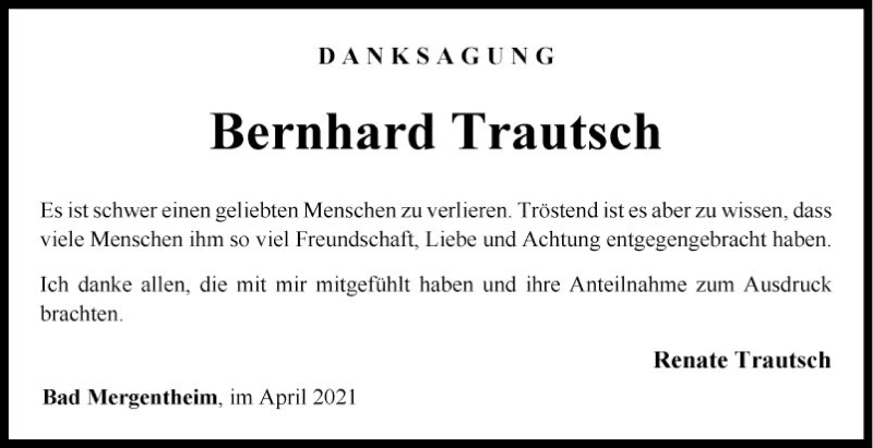 Hier finden Sie alle Traueranzeigen aus der Zeitung, die bisher für Bernhard Trautsch erschienen sind. Weitere Traueranzeigen, die in der Zeitung erscheinen, werden hier ebenfalls aufgelistet
