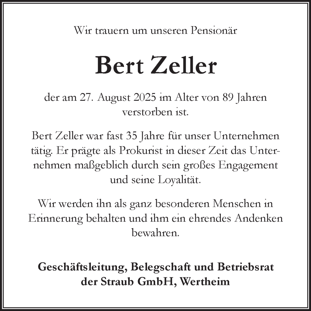 Hier finden Sie alle Traueranzeigen aus der Zeitung, die bisher für Bert Zeller erschienen sind. Weitere Traueranzeigen, die in der Zeitung erscheinen, werden hier ebenfalls aufgelistet
