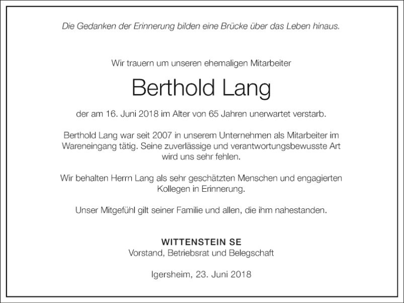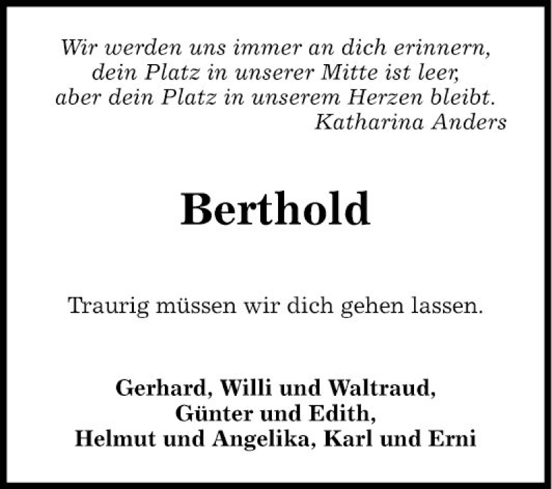 Hier finden Sie alle Traueranzeigen aus der Zeitung, die bisher für Berthold Lang erschienen sind. Weitere Traueranzeigen, die in der Zeitung erscheinen, werden hier ebenfalls aufgelistet