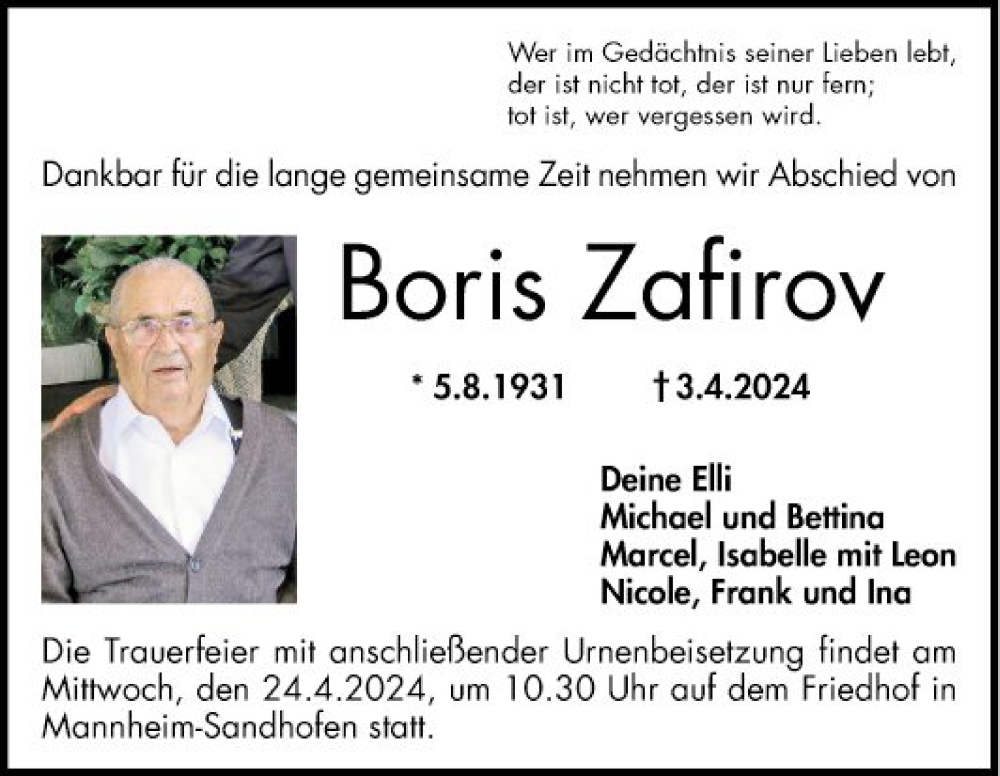 Hier finden Sie alle Traueranzeigen aus der Zeitung, die bisher für Boris Zafirov erschienen sind. Weitere Traueranzeigen, die in der Zeitung erscheinen, werden hier ebenfalls aufgelistet