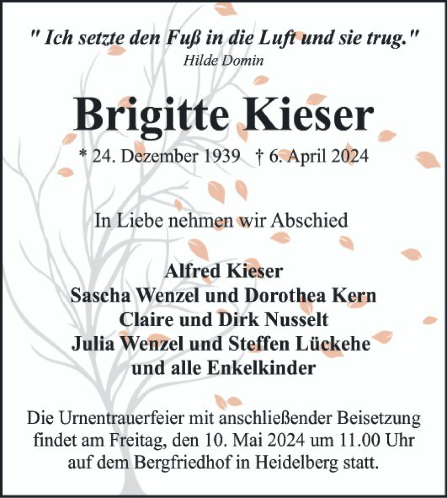 Hier finden Sie alle Traueranzeigen aus der Zeitung, die bisher für Brigitte Kieser erschienen sind. Weitere Traueranzeigen, die in der Zeitung erscheinen, werden hier ebenfalls aufgelistet