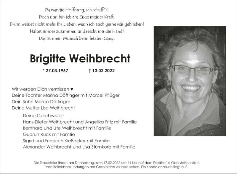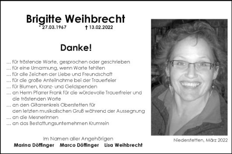 Hier finden Sie alle Traueranzeigen aus der Zeitung, die bisher für Brigitte Weihbrecht erschienen sind. Weitere Traueranzeigen, die in der Zeitung erscheinen, werden hier ebenfalls aufgelistet