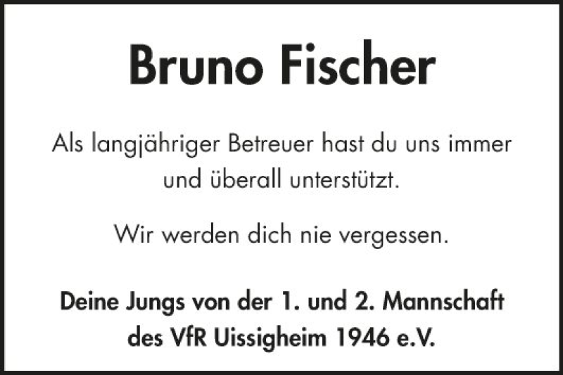 Hier finden Sie alle Traueranzeigen aus der Zeitung, die bisher für Bruno Fischer erschienen sind. Weitere Traueranzeigen, die in der Zeitung erscheinen, werden hier ebenfalls aufgelistet