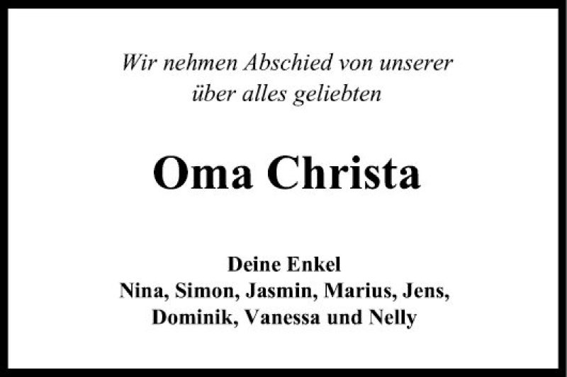 Hier finden Sie alle Traueranzeigen aus der Zeitung, die bisher für Christa erschienen sind. Weitere Traueranzeigen, die in der Zeitung erscheinen, werden hier ebenfalls aufgelistet