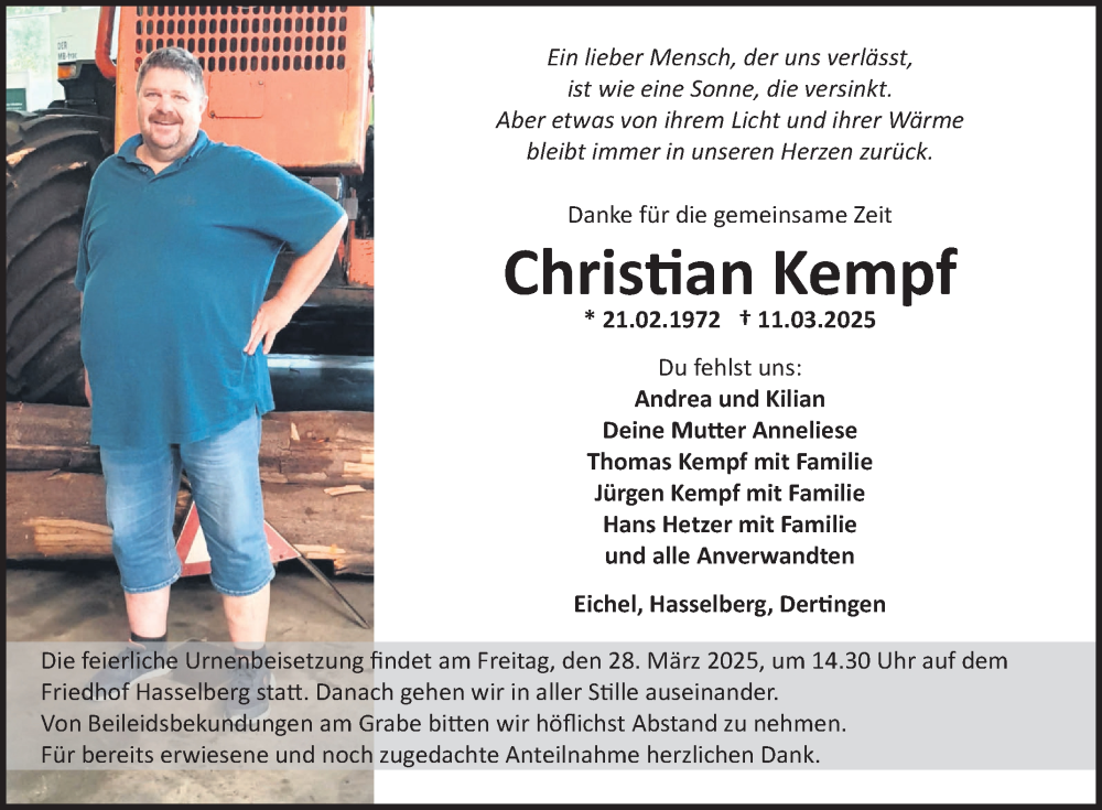 Hier finden Sie alle Traueranzeigen aus der Zeitung, die bisher für Christian Kempf erschienen sind. Weitere Traueranzeigen, die in der Zeitung erscheinen, werden hier ebenfalls aufgelistet
