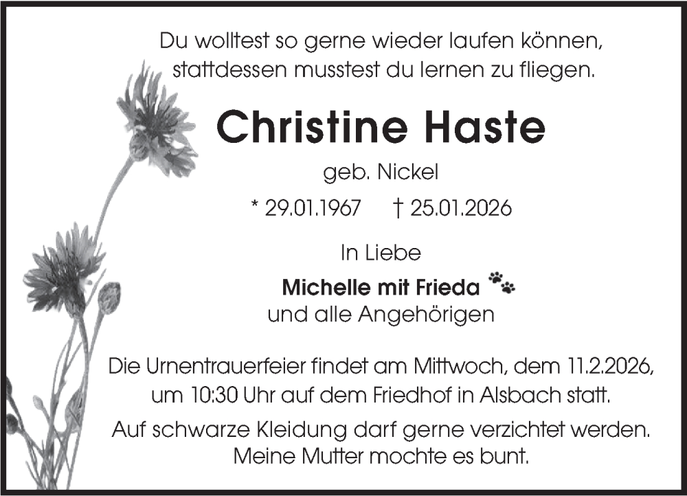 Hier finden Sie alle Traueranzeigen aus der Zeitung, die bisher für Christine Haste erschienen sind. Weitere Traueranzeigen, die in der Zeitung erscheinen, werden hier ebenfalls aufgelistet