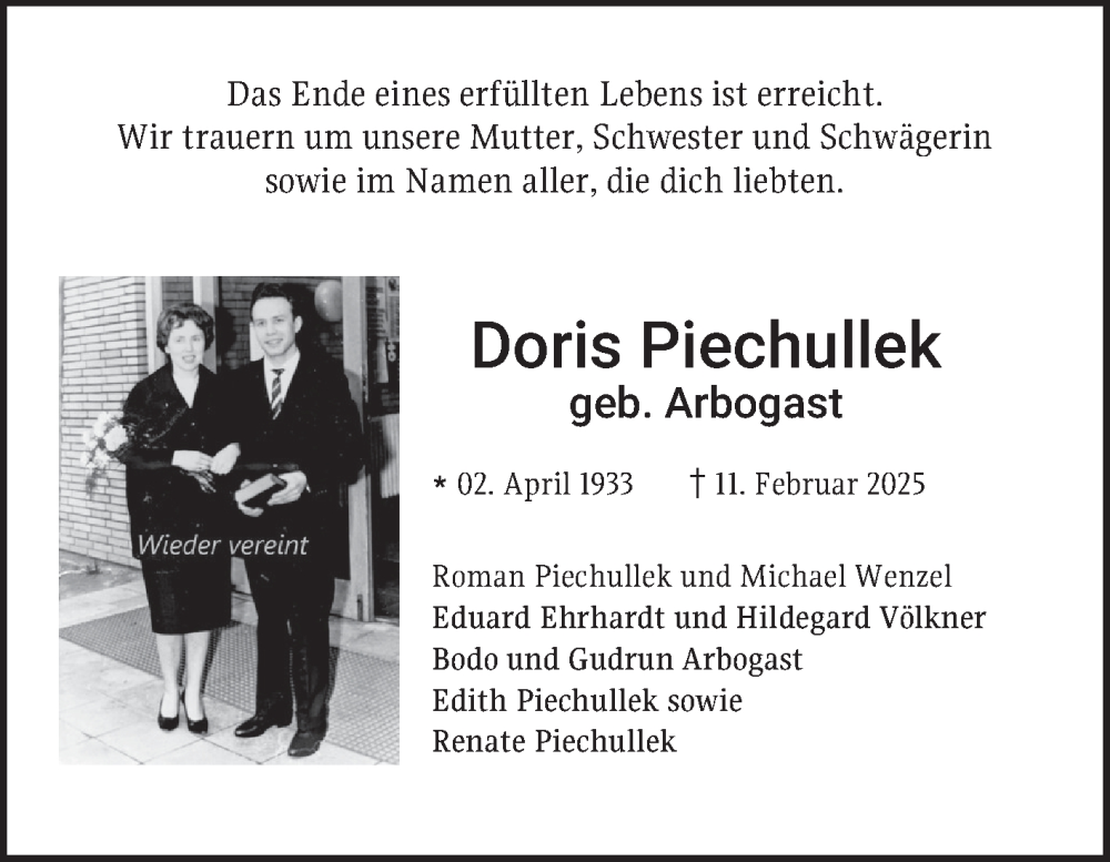 Hier finden Sie alle Traueranzeigen aus der Zeitung, die bisher für Doris Piechullek erschienen sind. Weitere Traueranzeigen, die in der Zeitung erscheinen, werden hier ebenfalls aufgelistet