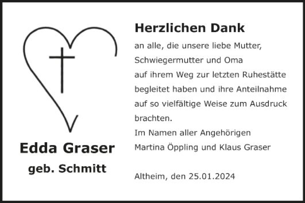 Hier finden Sie alle Traueranzeigen aus der Zeitung, die bisher für Edda Graser erschienen sind. Weitere Traueranzeigen, die in der Zeitung erscheinen, werden hier ebenfalls aufgelistet