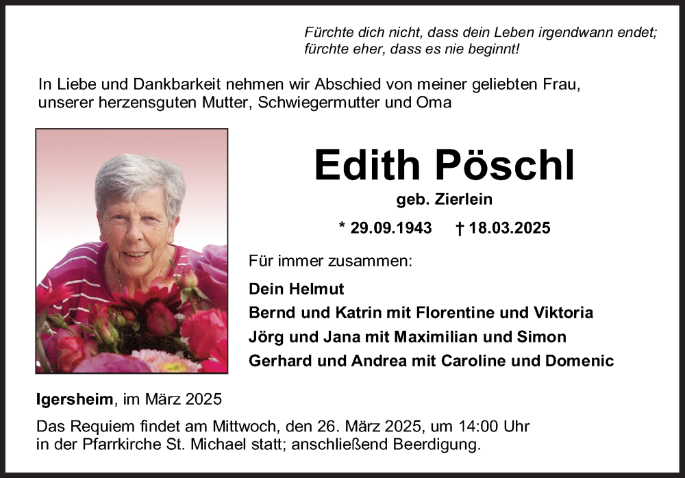 Hier finden Sie alle Traueranzeigen aus der Zeitung, die bisher für Edith Pöschl erschienen sind. Weitere Traueranzeigen, die in der Zeitung erscheinen, werden hier ebenfalls aufgelistet