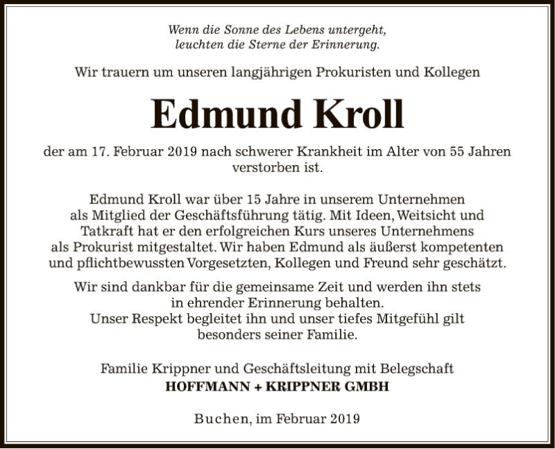 Hier finden Sie alle Traueranzeigen aus der Zeitung, die bisher für Edmund Kroll erschienen sind. Weitere Traueranzeigen, die in der Zeitung erscheinen, werden hier ebenfalls aufgelistet