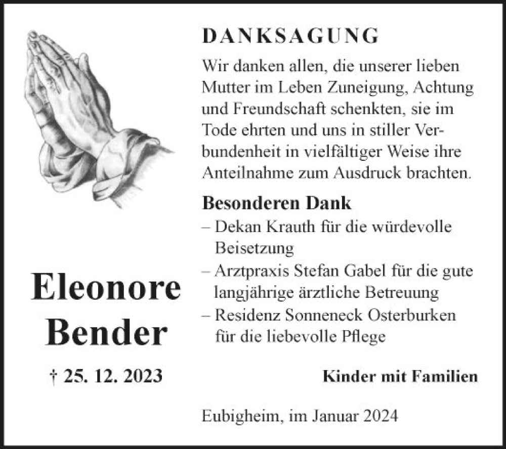 Hier finden Sie alle Traueranzeigen aus der Zeitung, die bisher für Eleonore Bender erschienen sind. Weitere Traueranzeigen, die in der Zeitung erscheinen, werden hier ebenfalls aufgelistet