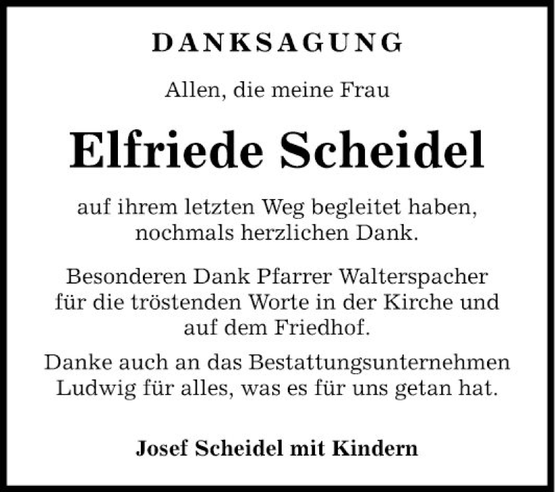 Hier finden Sie alle Traueranzeigen aus der Zeitung, die bisher für Elfriede Scheidel erschienen sind. Weitere Traueranzeigen, die in der Zeitung erscheinen, werden hier ebenfalls aufgelistet