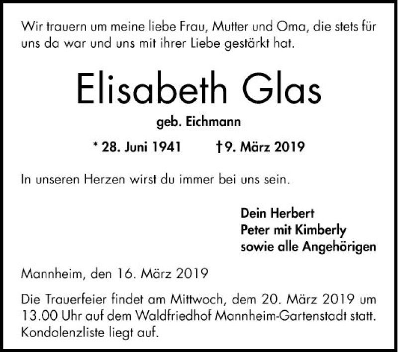Hier finden Sie alle Traueranzeigen aus der Zeitung, die bisher für Elisabeth Glas erschienen sind. Weitere Traueranzeigen, die in der Zeitung erscheinen, werden hier ebenfalls aufgelistet