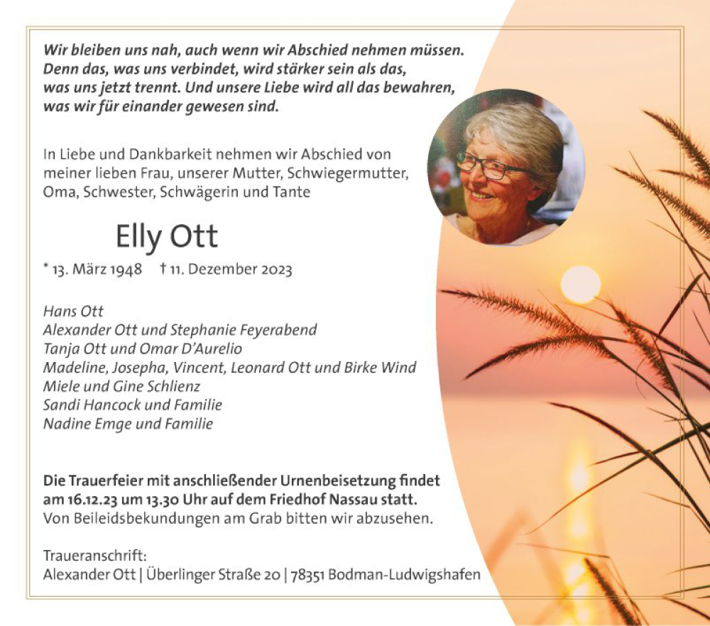 Hier finden Sie alle Traueranzeigen aus der Zeitung, die bisher für Elly Ott erschienen sind. Weitere Traueranzeigen, die in der Zeitung erscheinen, werden hier ebenfalls aufgelistet