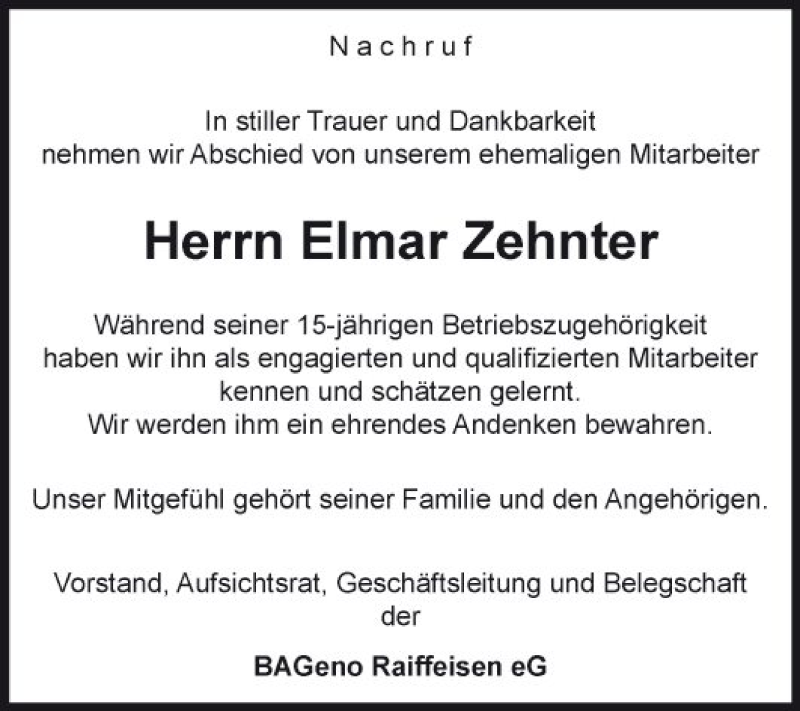 Hier finden Sie alle Traueranzeigen aus der Zeitung, die bisher für Elmar Zehnter erschienen sind. Weitere Traueranzeigen, die in der Zeitung erscheinen, werden hier ebenfalls aufgelistet
