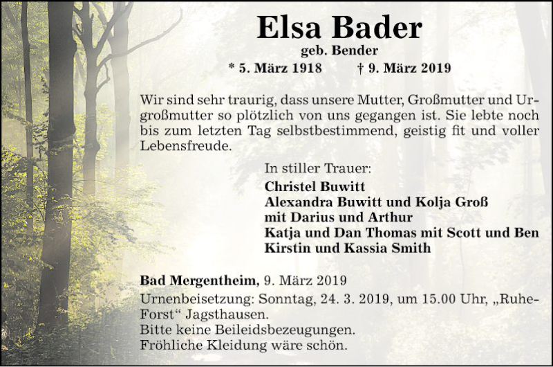 Hier finden Sie alle Traueranzeigen aus der Zeitung, die bisher für Elsa Bader erschienen sind. Weitere Traueranzeigen, die in der Zeitung erscheinen, werden hier ebenfalls aufgelistet