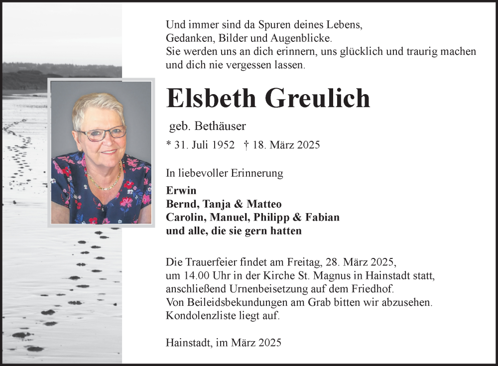Hier finden Sie alle Traueranzeigen aus der Zeitung, die bisher für Elsbeth Greulich erschienen sind. Weitere Traueranzeigen, die in der Zeitung erscheinen, werden hier ebenfalls aufgelistet