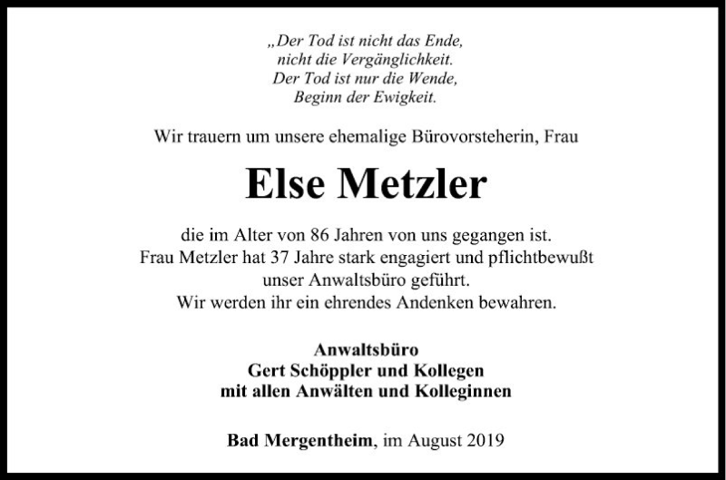 Hier finden Sie alle Traueranzeigen aus der Zeitung, die bisher für Else Metzler erschienen sind. Weitere Traueranzeigen, die in der Zeitung erscheinen, werden hier ebenfalls aufgelistet