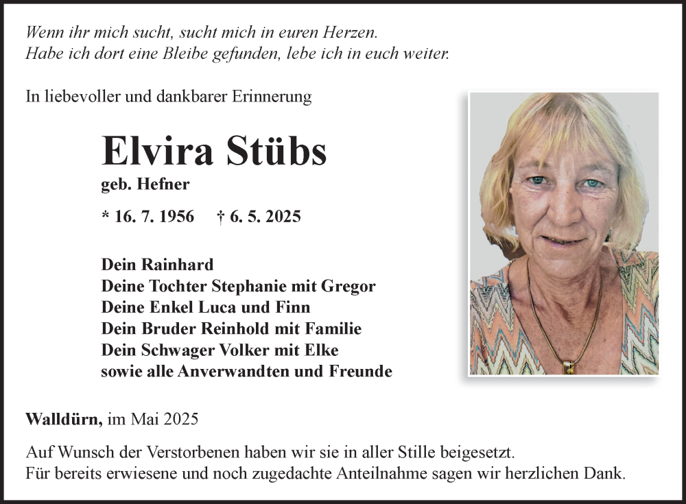 Hier finden Sie alle Traueranzeigen aus der Zeitung, die bisher für Elvira Stübs erschienen sind. Weitere Traueranzeigen, die in der Zeitung erscheinen, werden hier ebenfalls aufgelistet