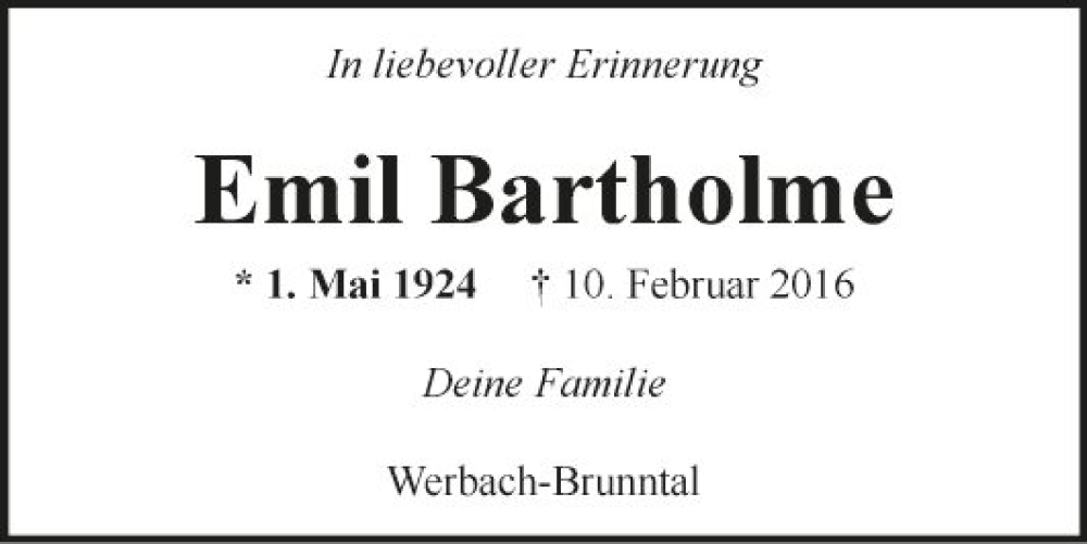 Hier finden Sie alle Traueranzeigen aus der Zeitung, die bisher für Emil Bartholme erschienen sind. Weitere Traueranzeigen, die in der Zeitung erscheinen, werden hier ebenfalls aufgelistet