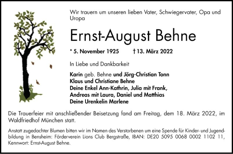 Hier finden Sie alle Traueranzeigen aus der Zeitung, die bisher für Ernst-August Behne erschienen sind. Weitere Traueranzeigen, die in der Zeitung erscheinen, werden hier ebenfalls aufgelistet