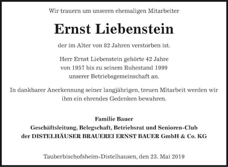 Hier finden Sie alle Traueranzeigen aus der Zeitung, die bisher für Ernst Liebenstein erschienen sind. Weitere Traueranzeigen, die in der Zeitung erscheinen, werden hier ebenfalls aufgelistet
