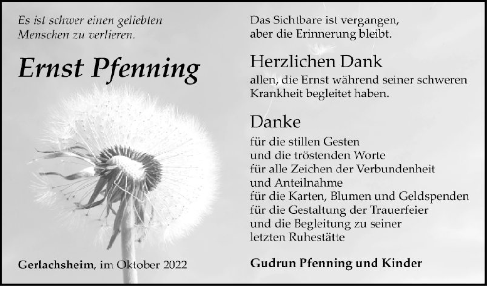 Hier finden Sie alle Traueranzeigen aus der Zeitung, die bisher für Ernst Pfenning erschienen sind. Weitere Traueranzeigen, die in der Zeitung erscheinen, werden hier ebenfalls aufgelistet