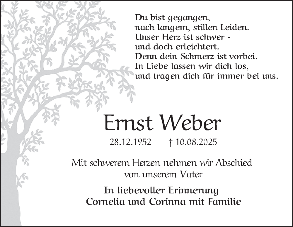 Hier finden Sie alle Traueranzeigen aus der Zeitung, die bisher für Ernst Weber erschienen sind. Weitere Traueranzeigen, die in der Zeitung erscheinen, werden hier ebenfalls aufgelistet
