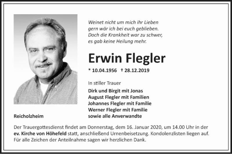 Hier finden Sie alle Traueranzeigen aus der Zeitung, die bisher für Erwin Flegler erschienen sind. Weitere Traueranzeigen, die in der Zeitung erscheinen, werden hier ebenfalls aufgelistet