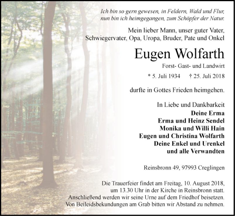 Hier finden Sie alle Traueranzeigen aus der Zeitung, die bisher für Eugen Wolfarth erschienen sind. Weitere Traueranzeigen, die in der Zeitung erscheinen, werden hier ebenfalls aufgelistet