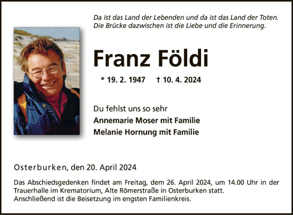Hier finden Sie alle Traueranzeigen aus der Zeitung, die bisher für Franz Földi erschienen sind. Weitere Traueranzeigen, die in der Zeitung erscheinen, werden hier ebenfalls aufgelistet