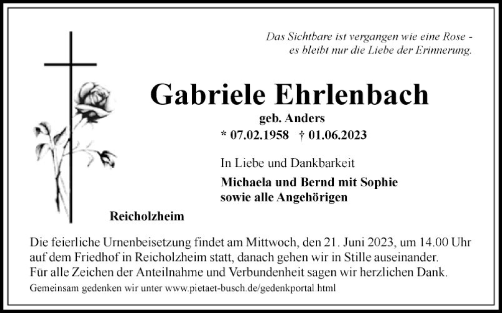 Hier finden Sie alle Traueranzeigen aus der Zeitung, die bisher für Gabriele Ehrlenbach erschienen sind. Weitere Traueranzeigen, die in der Zeitung erscheinen, werden hier ebenfalls aufgelistet