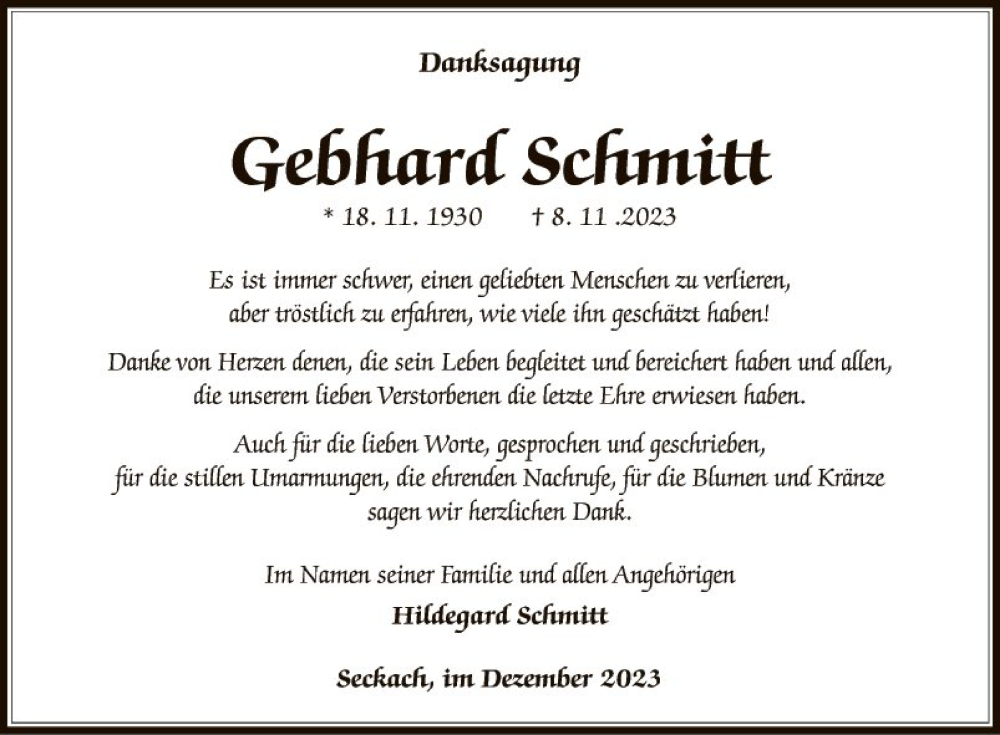 Hier finden Sie alle Traueranzeigen aus der Zeitung, die bisher für Gebhard Schmitt erschienen sind. Weitere Traueranzeigen, die in der Zeitung erscheinen, werden hier ebenfalls aufgelistet
