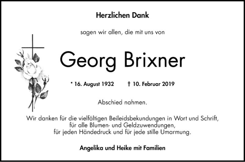 Hier finden Sie alle Traueranzeigen aus der Zeitung, die bisher für Georg Brixner erschienen sind. Weitere Traueranzeigen, die in der Zeitung erscheinen, werden hier ebenfalls aufgelistet